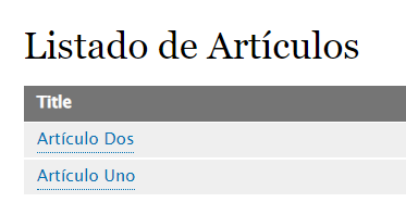 Con la vista ya creada si accedemos directamente a la ruta para su visualización <nombre-proyecto>/articles-list se puede observar que muestra los contenidos en ambos idiomas, independientemente del idioma seleccionado para la interfaz de la web.